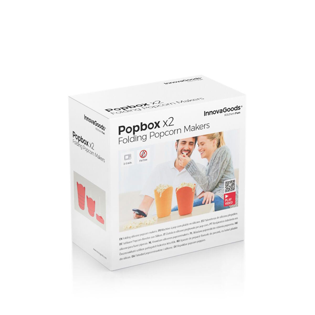 En uppsättning med två separata popcornskålar med en originell hopvikbar design i silikon. De har mått längst ner för att kunna dosera rätt mängd och för att lätt kunna poppa sundare och fettfria popcorn i mikrovågsugnen. Samma skål kan även användas för att servera popcornen. Den kan diskas i diskmaskinen. Ett mycket mer praktiskt sätt att poppa hälsosamma och hemgjorda popcorn på bara några minuter och att njuta av dem tillsammans.