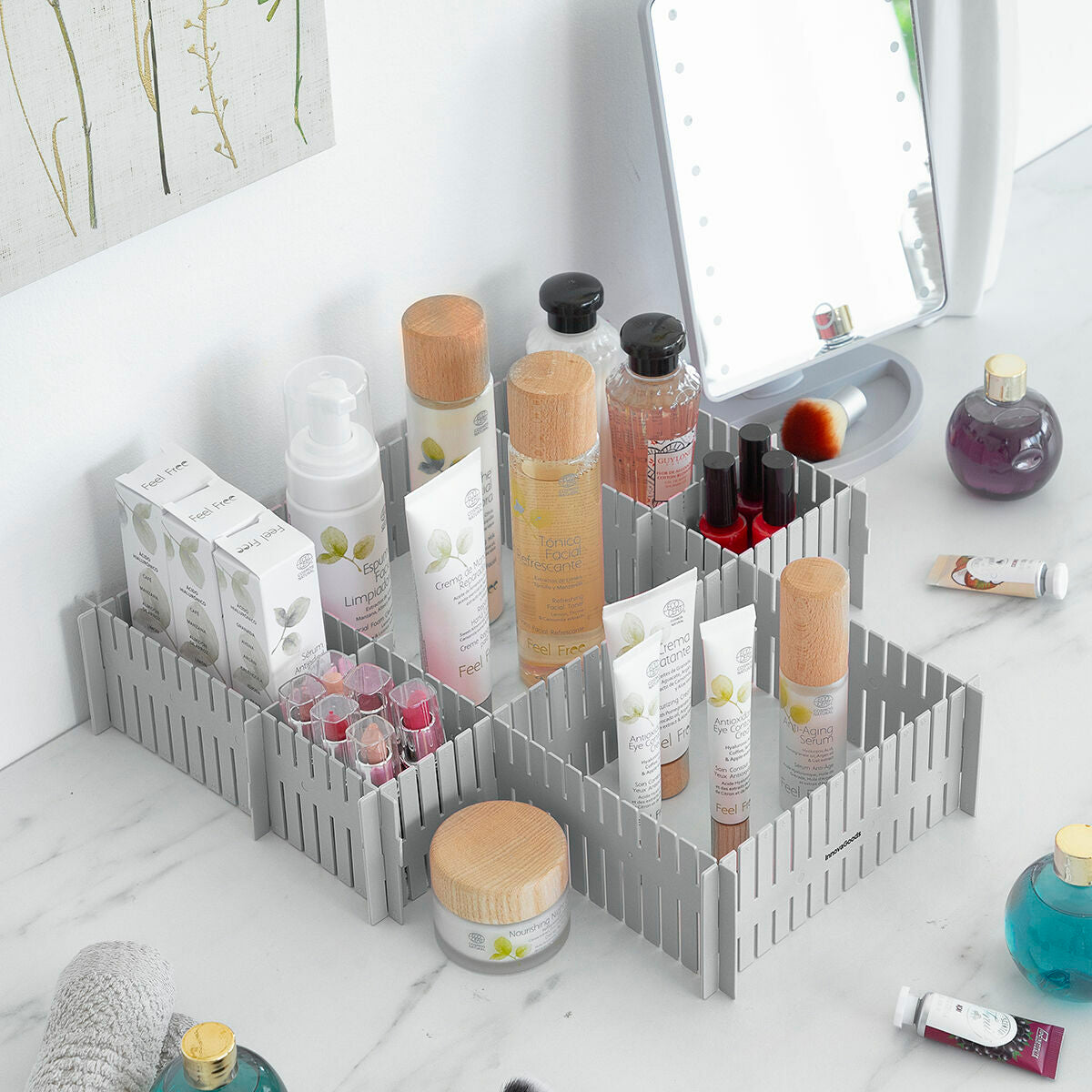 Denna justerbara lådarrangör anpassar sig perfekt till olika dimensioner och utrymmen, efter dina behov. Den innehåller instruktioner för användning för att placera den korrekt i olika positioner. De 16 medföljande enheterna kan skäras och sammanfogas vinkelrätt för att helt passa det önskade utrymmet. De kan också placeras vertikalt.